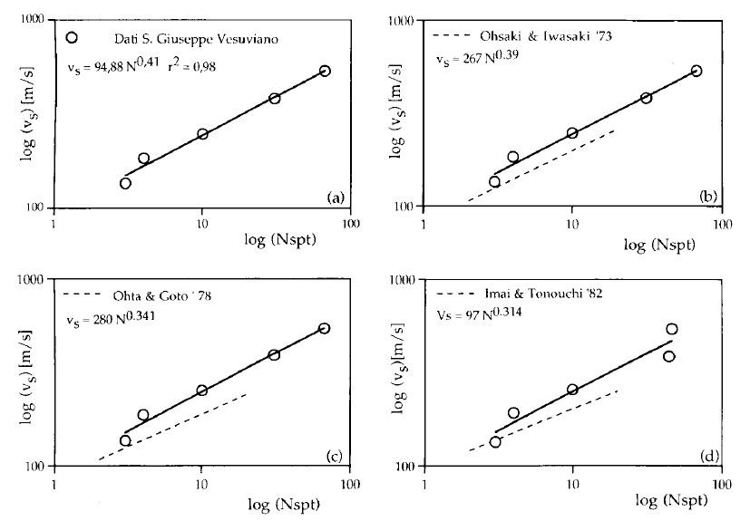 Se si confrontano i profili delle velocità con quelli ottenuti dai sondaggi penetrometrici, si può evidenziare come in corripsondenza dei cambi di velocità, soprattutto quelli più marcati registrati alla profondità media di 6 metri al passaggio tra gli accumuli di flussi piroclastici, il numero di colpi delle prove SPT assume valori molto elevati fino a far registrare l’arresto della prova. Queste osservazioni confermano che i depositi cineritici connessi a flussi piroclastici sono caretterizzati da buone proprietà meccaniche. I valori delle velocità Vs, ottenuti dalle misure SASW, ed i valori NSPT sono stati confrontati in un diagramma bi-logaritmico, (Vedi Fig. 6). La legge di correlazione è di tipo esponenziale, con l’esponenete che assume valore pari a 0.41. Per operare tale correlazione sono stati considerati i valori medi delle velocità delle onde di taglio e del numero dei colpi delle prove penetrometriche per ogni orizzonte litologico riconosciuto. La legge di correlazione sviluppata per i dati sperimentali è stata confrontata con alcune leggi di correlazione riportate in letteratura è proposte da alcuni Autori giapponesi: Ohsaki & Iwasaki (1973), Ohta & Goto (1978), Imai & Tonouchi (1982). Dall’analisi dei confronti rappresentati in figura si evidenzia che la legge di correlazione proposta da Ohsaki & Iwasaki è quella che più si avvicina alla legge di correlazione per le misure del sito di S. Giuseppe Vesuviano, per la quale l’esponente è di 0.39.