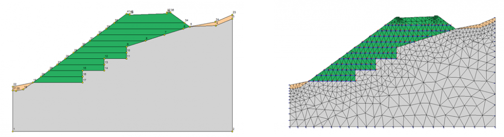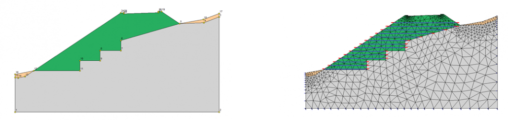 Quando invece si sceglie di utilizzare gli elementi “geogrid” è necessario preparare prima la mesh, la connessione tra questi elementi “linea” e “piano” viene applicata solo ai nodi (Fig.2)