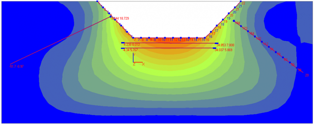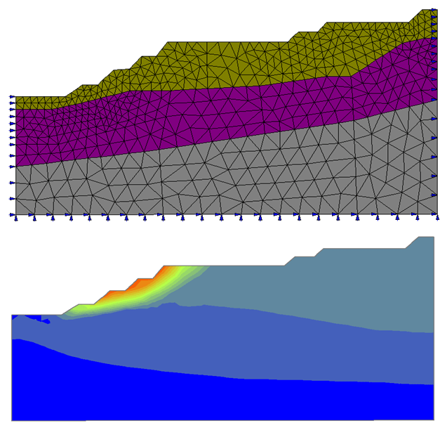 Diversi valori crescenti del coefficiente SRF (Fattore di Riduzione di Resistenza) si ottengono finché l’algoritmo non fallisce la convergenza, e, a quel punto, il fattore SRF determinato si assume come un fattore di sicurezza. In realtà ciò significa che nessuna configurazione delle distribuzioni delle sollecitazioni raggiunta è in grado di soddisfare il criterio di rottura e determinare l’equilibrio globale.