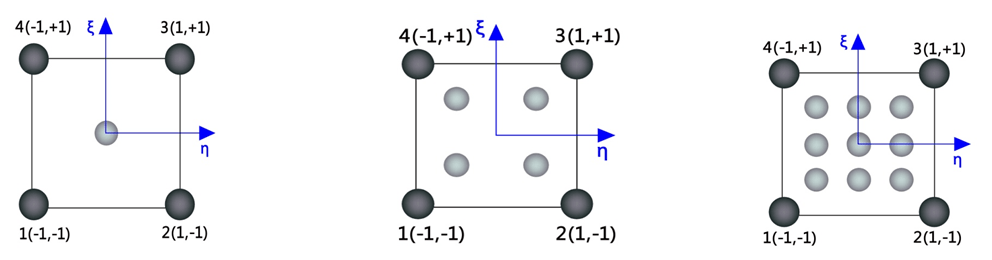 Le matrici delle rigidezze ed i vettori dei carichi, per elementi di forma triangolare e quadrangolare sono valutati numericamente utilizzando la tecnica integrazione di Gauss applicata nei punti di campionamento o punti di quadratura di Gauss.