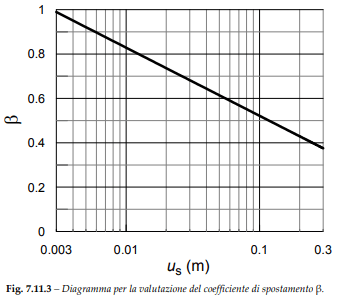 Per la valutazione della spinta nelle condizioni di equilibrio limite passivo deve porsi α = 1. Il valore del coefficiente β può essere ricavato dal diagramma di Fig. 7.11.3, in funzione del massimo spostamento permanente us che l’opera può tollerare.