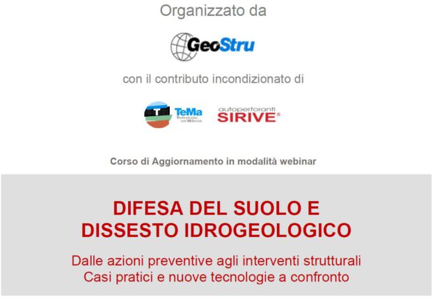 PRESENTAZIONE Il webinar propone una panoramica di alcune tecnologie applicabili al settore della difesa del suolo e del dissesto idrogeologico, presentando sia aspetti tecnico normativi che applicativi. Programma: 14:00 APERTURA COLLEGAMENTO (si consiglia di collegarsi con anticipo rispetto all’orario di inizio del webinar per consentire agli organizzatori di risolvere eventuali problemi di accesso alla piattaforma da…