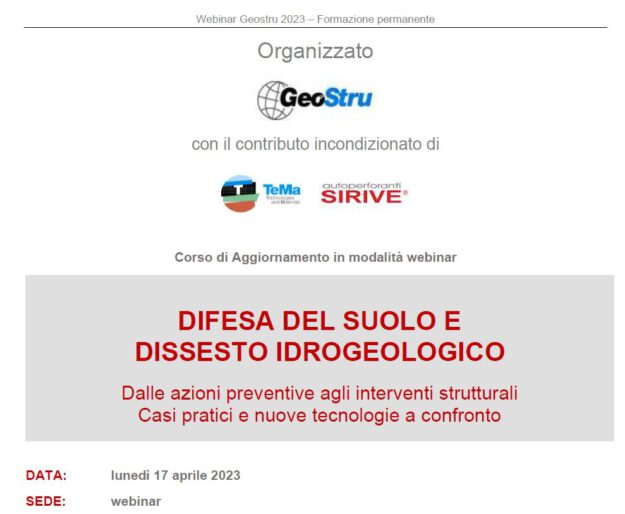 Corso di Aggiornamento in modalità webinar DIFESA DEL SUOLO E DISSESTO IDROGEOLOGICO Dalle azioni preventive agli interventi strutturali Casi pratici e nuove tecnologie a confronto DATA: Lunedì 05 Giugno 2023 SEDE: webinar ORARI: 14:00 – 17:45 (registrazione partecipanti a partire dalle 13:30) DOCENTI: Ing. Massimiliano Nart (Tema Srl) Ing. Anna Lippelli (Geostru) Ing. Alberto Bisson…