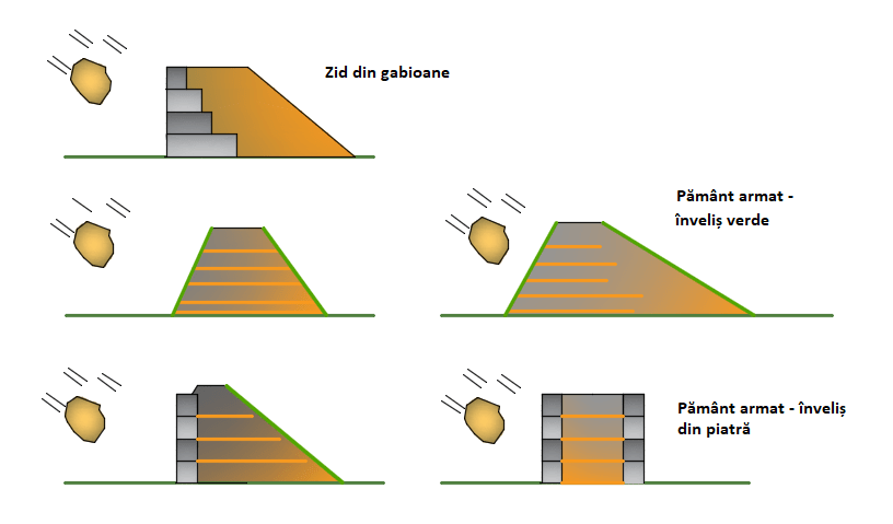 De exemplu, terasamentele pot fi realizate dintr-un material incoerent grosier susținut pe partea din aval de pereți sau, alternativ, realizat cu pământ armat, care permite o întindere interioară, pe partea montană, cu o înclinație aproape verticală, care garantează o acțiune mai eficientă în blocarea rocilor.