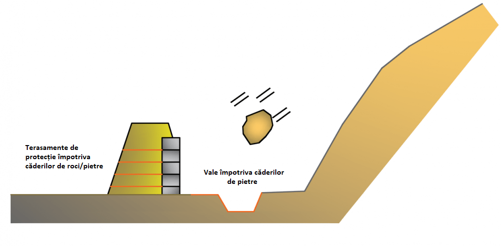 „Lucrarea impotriva căderilor de pietre” se realizează prin excavarea unei cunete, în formă adecvată, în funcție de morfologia și înclinația escavării în amonte de intervenție.