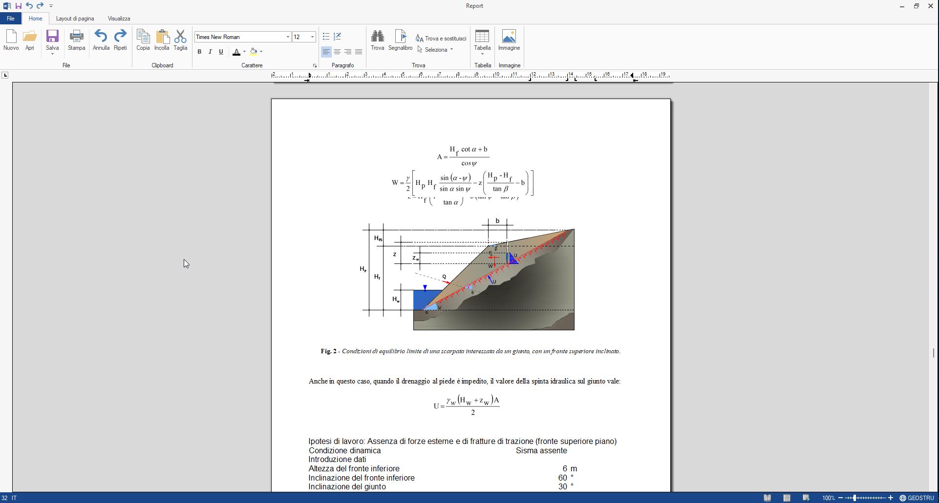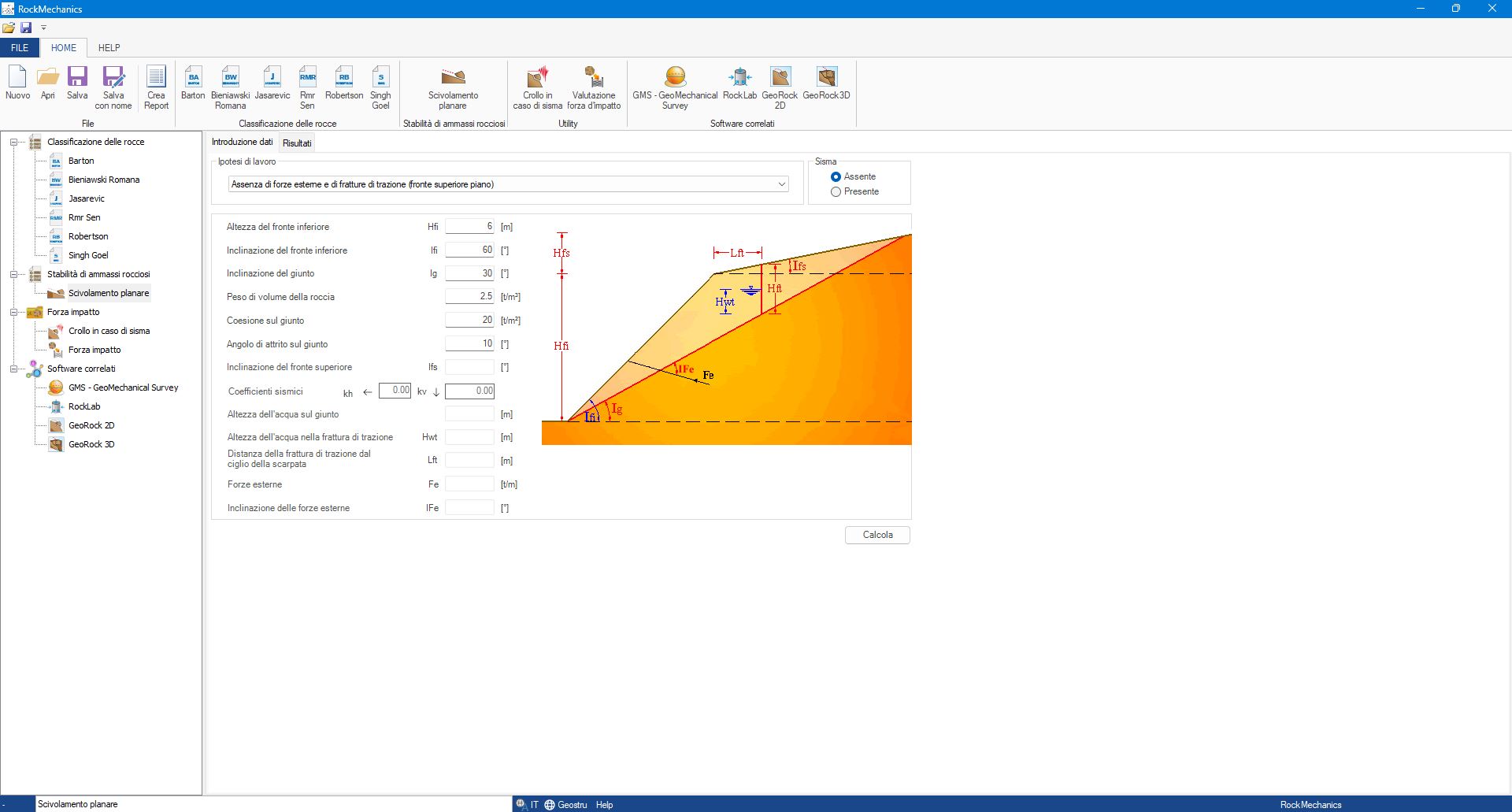 Esegue l’analisi delle condizioni di stabilità di un blocco separato da una discontinuità con inclinazione inferiore a quella del fronte. L’analisi viene condotta ricercando le condizioni di equilibrio delle sole forze agenti e trascurando l’equilibrio dei momenti. Il calcolo viene eseguito in assenza o in presenza di una frattura di trazione aperta nella parte alta della scarpata, in assenza o presenza di sisma, in assenza o in presenza di acqua, in assenza o in presenza di forze esterne. Inoltre il programma esegue la verifica sia su fronti con parte superiore piana sia su fronti con fronte superiore inclinata.