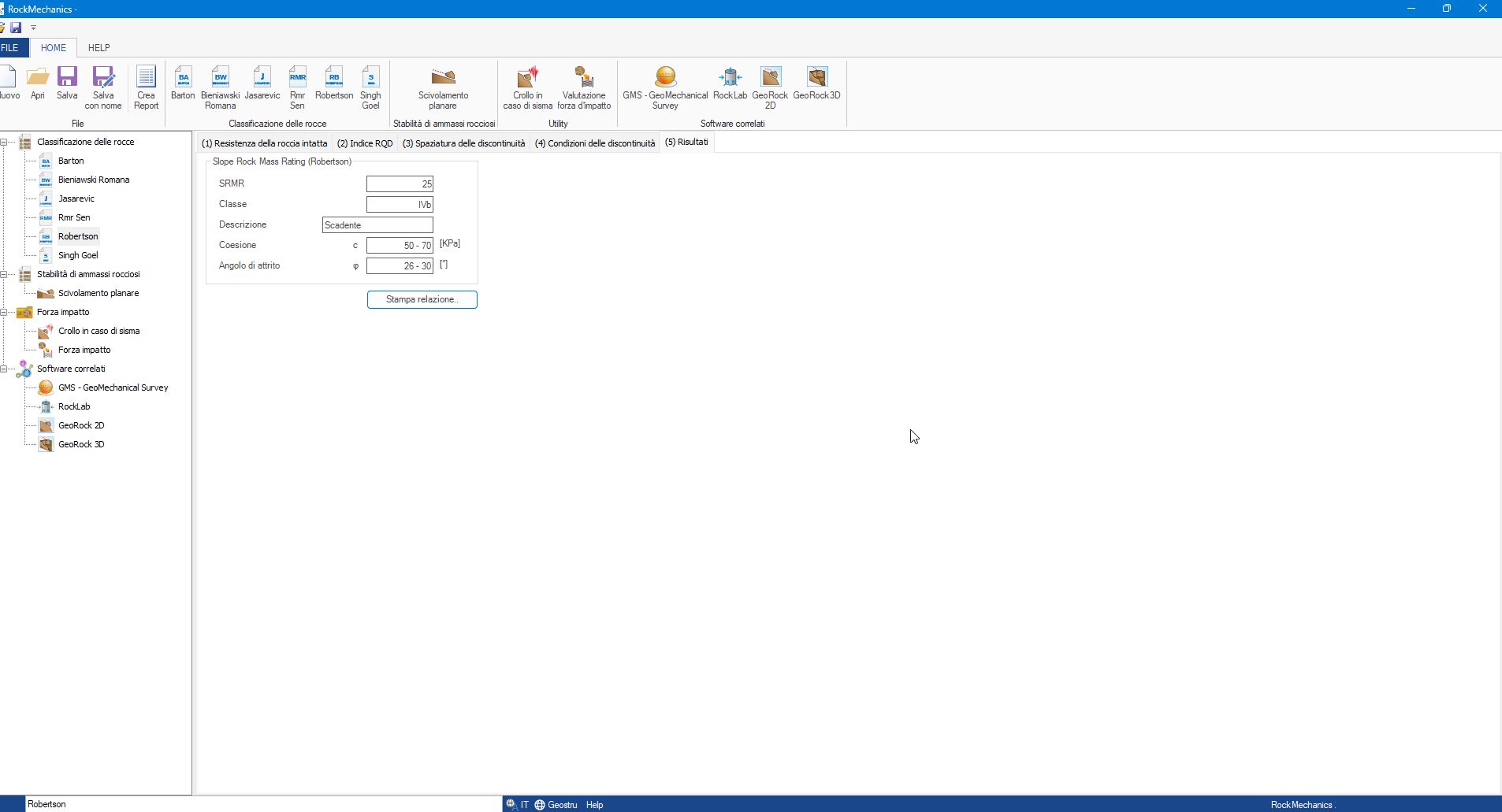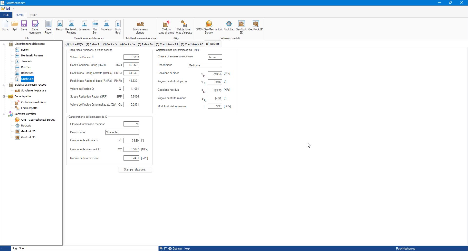 Inseriti in ingresso i valori numerici A1, A2, A3, A4, A5 derivati rispettivamente dalla resistenza della roccia, dall’indice RQD, dalla spaziatura delle discontinuità, dalle condizioni delle discontinuità e idrauliche, e inserito il coefficiente A6 che è l’indice di correzione per la giacitura delle discontinuità, il programma, con il metodo di Beniawski, calcola RMRbase, RMRcorretto, classe e qualità dell’ammasso roccioso, modulo di deformazione, indice GSI (Geological Strenght index), coesione e angolo di attrito dell’ammasso sia di picco che residui. Inoltre inserendo i valori dei fattori F1 (che dipende dal parallelismo fra immersione del fronte e immersione del giunto), F2 (riferito all’inclinazione del giunto), F3 (che relaziona l’inclinazione del fronte con quella dei giunti), F4 (legato al metodo di scavo), il programma, con il metodo di Romana, calcola SMR, classe e qualità dell’ammasso roccioso, la stabilità del versante, il modo di rottura e il tipo di interventi di stabilizzazione.